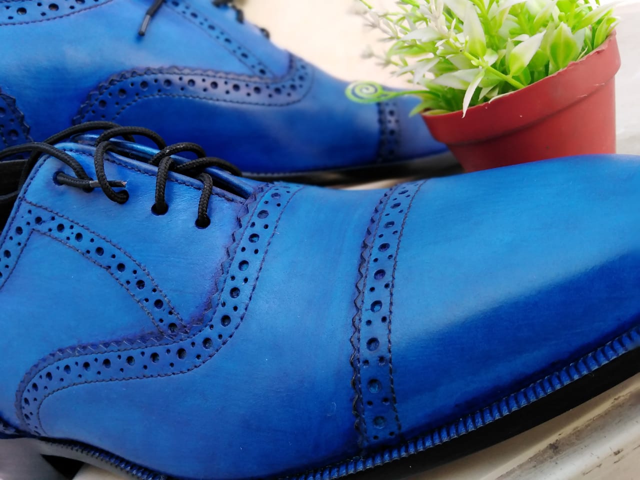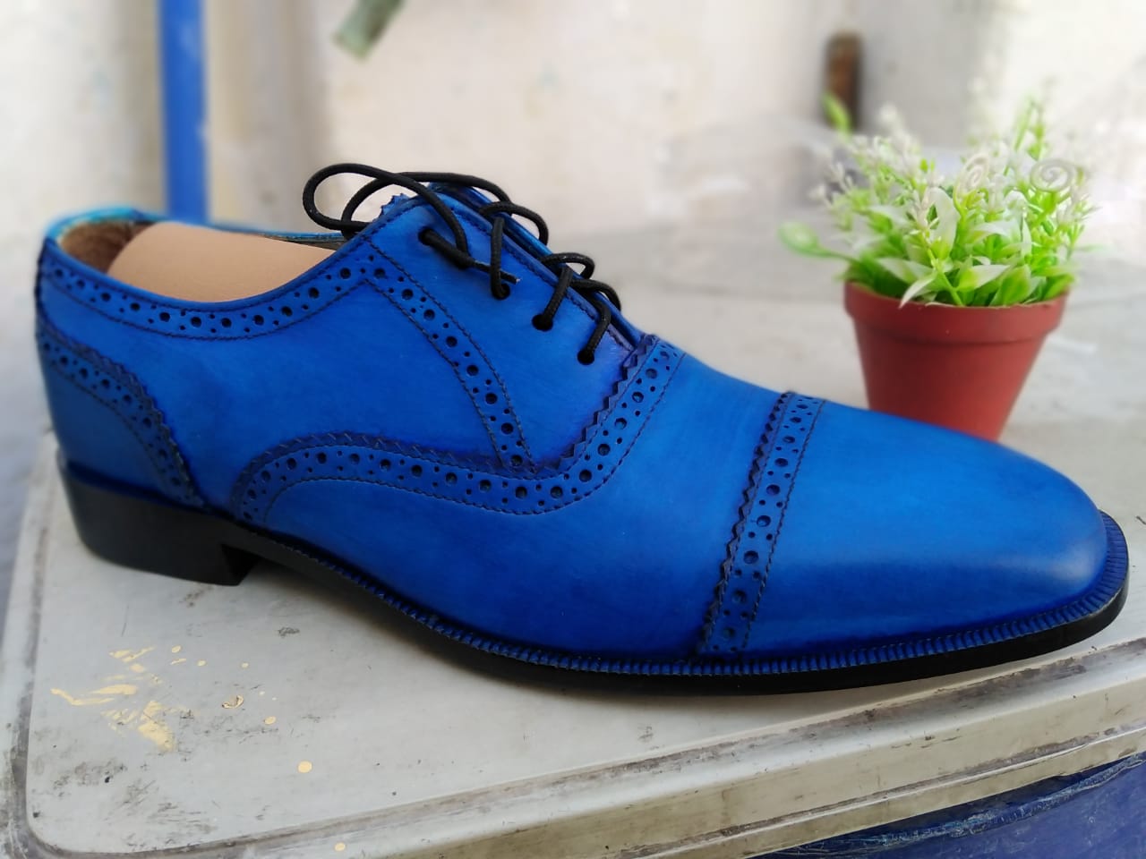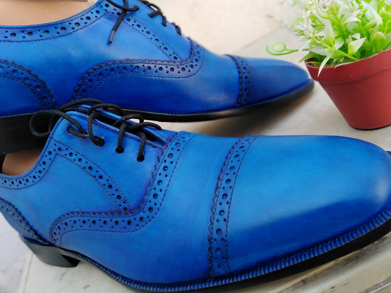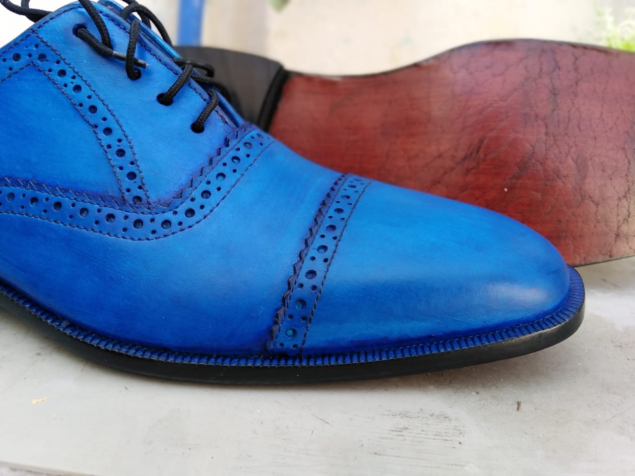 New Hot Sale Men's Blue Oxfords Derby Cap Toe Handmade Genuine Leather Dress Shoes