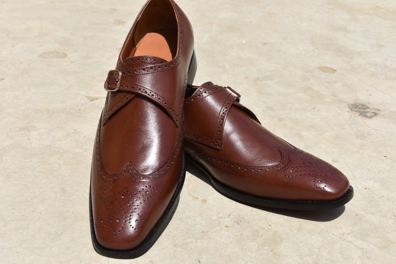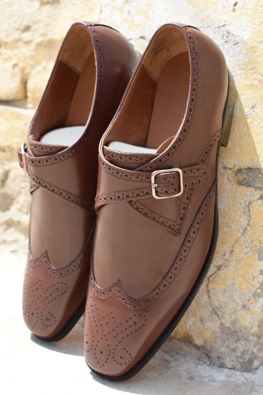 Classic Men's Brown Wingtip Single Monk Strap Genuine Leather Shoes