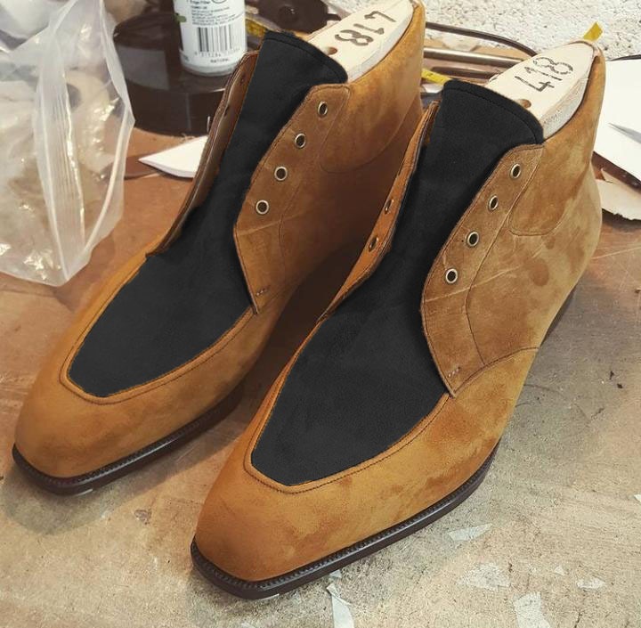 Classic Hand Stitch Brown Black Suede Ankle High Lace Up Boot