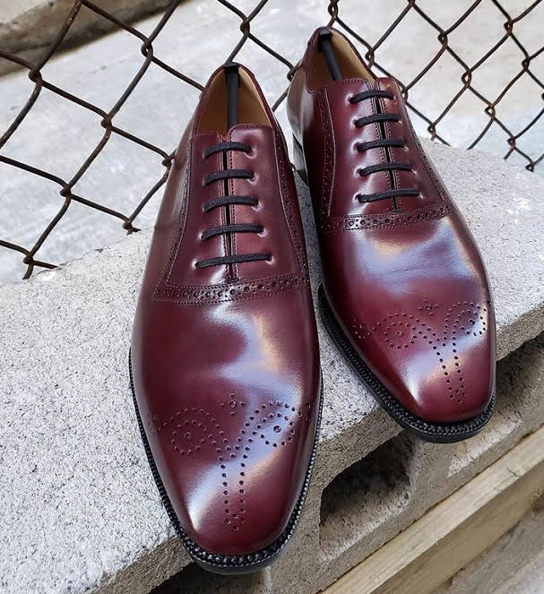 Handmade Men High Personality Burgundy Oxford Brogue Lace Up Formal Shoes For Men In Genuine Leather