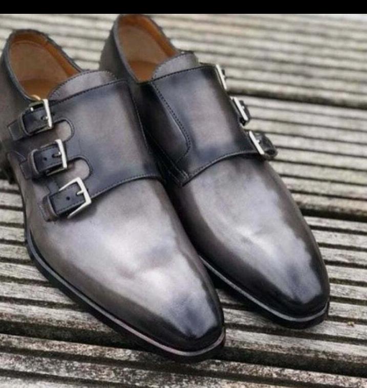 Classic Men's Grey Black Triple Monk Strap Leather Shoes