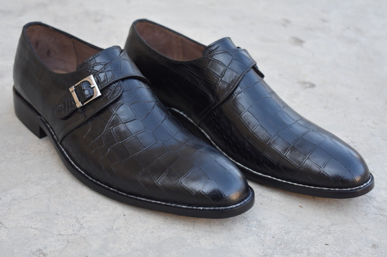 Easter Sale Men's Black Alligator Skin Shoes, Single Monk Strap Leather Shoes