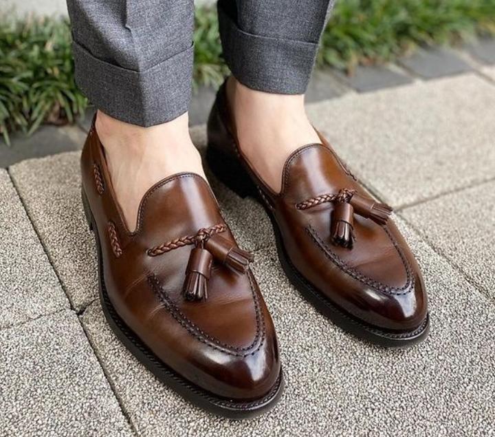 Top Fashion Men's Hand Stitch Dark Brown Tassels Loafer Leather Shoes
