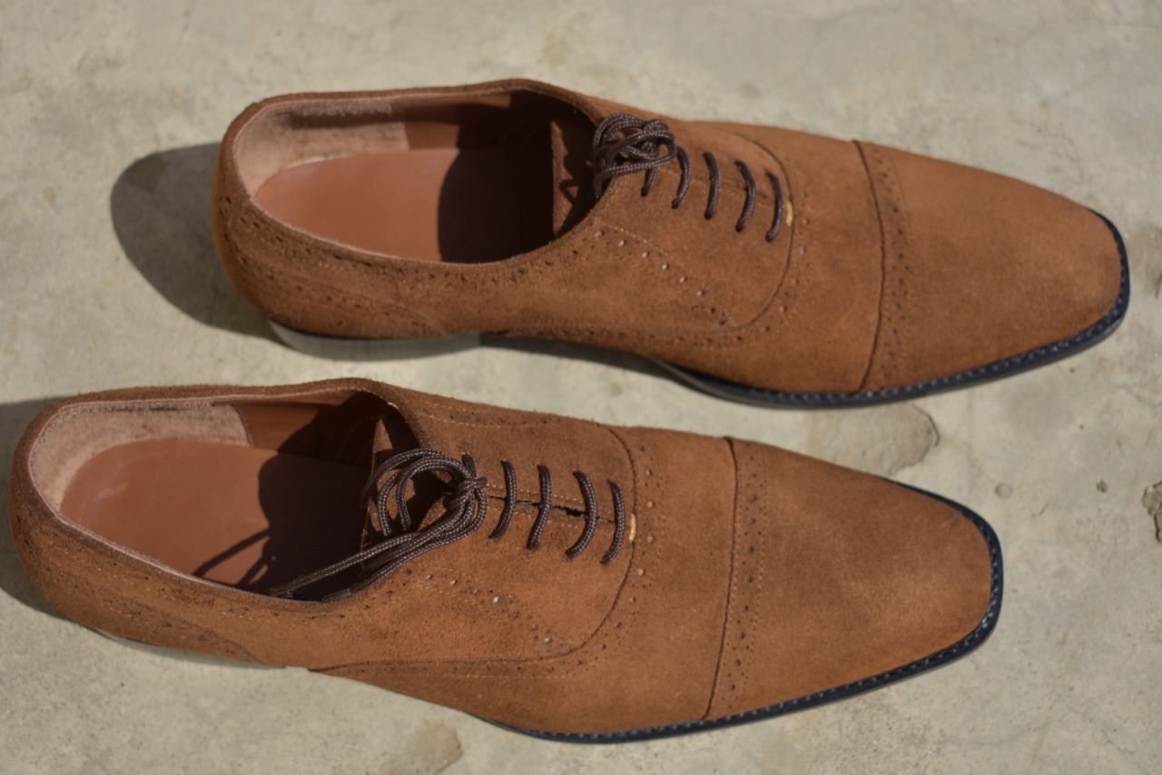 Unique Men's Hand Stitch Brown Shoes, Cap toe Lace Up Suede Formal Shoes