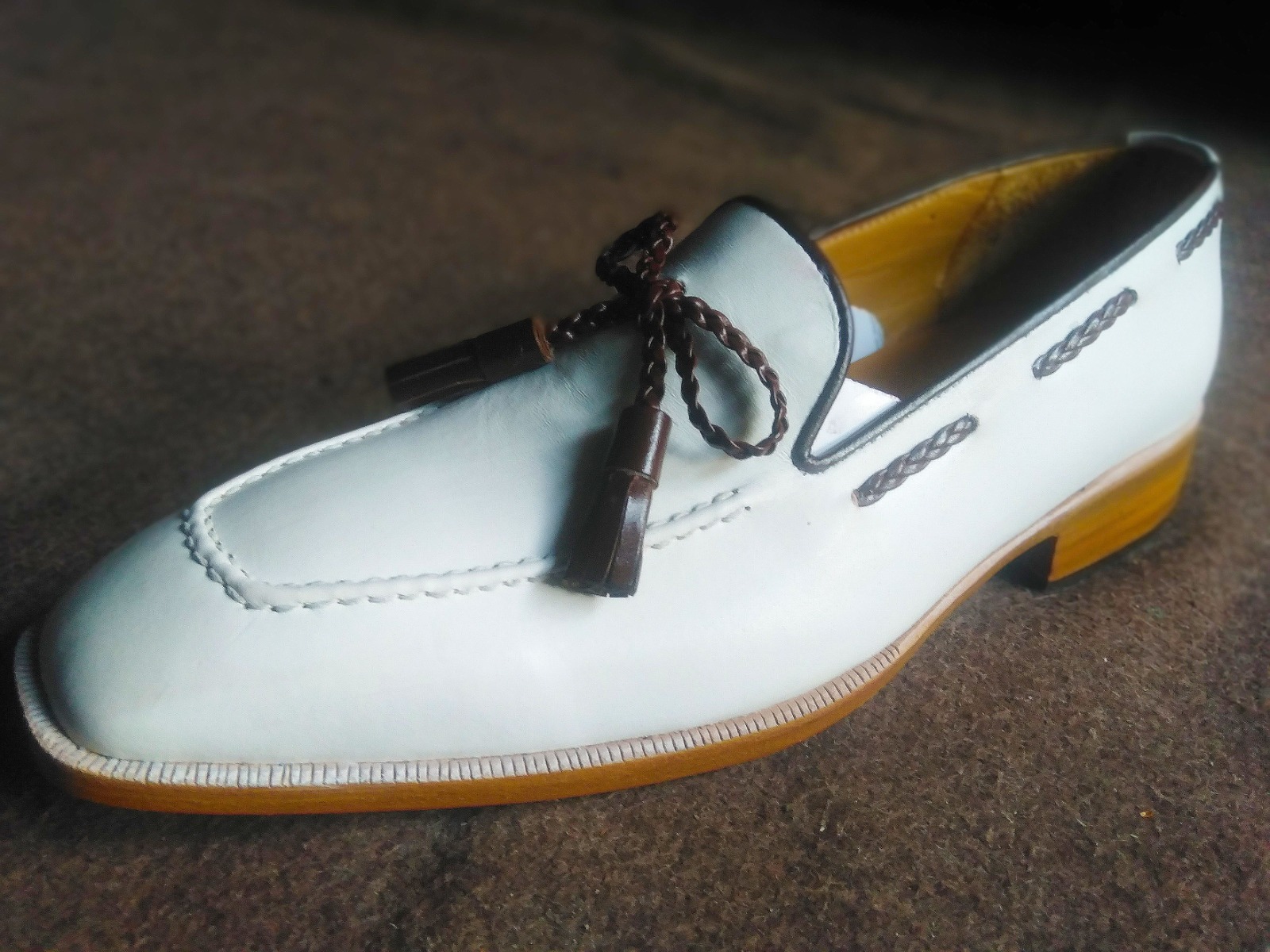 Latest Men's Hand Stitch White Tassels Loafer Shoes, Genuine Leather Formal Wear Shoes