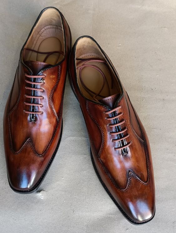 Unique Men's Hand Stitch Brown Wingtip Shoes, Genuine Leather Lace Up Christmas Shoes