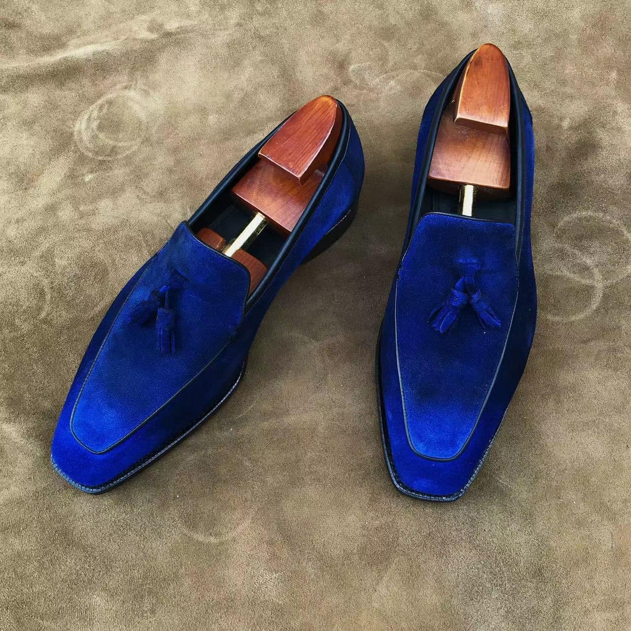 Christmas Men's Handmade Blue Tassels Loafer Style Genuine Suede Formal Shoes